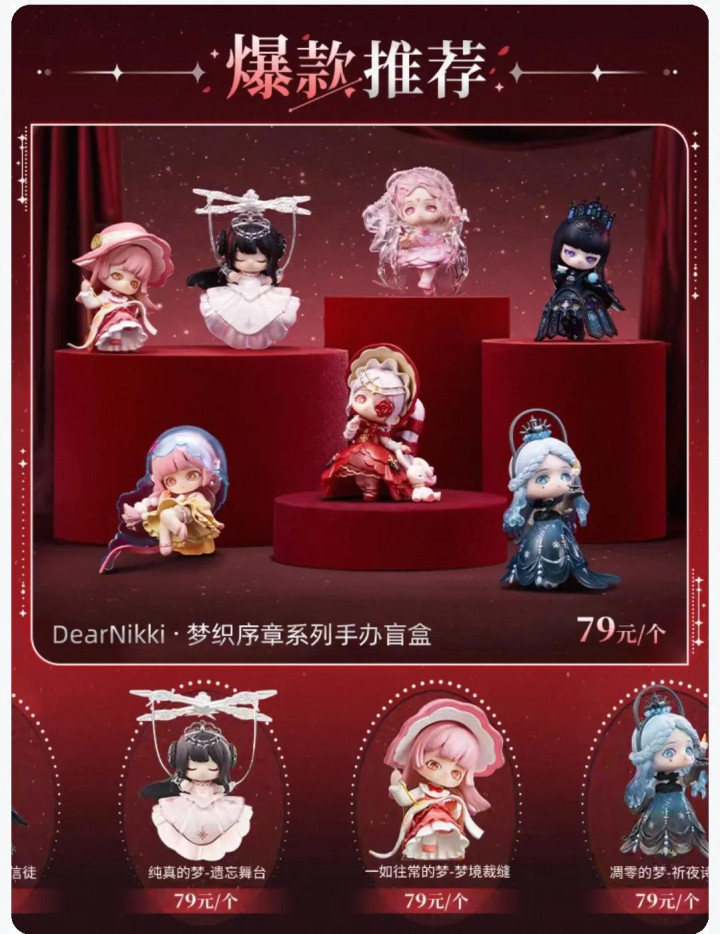 经久以来,叠纸的附近阶梯看起来相对高冷:只在自营天猫店卖,少许分销,把渠谈和利润紧紧合手在我方手里。但在2025年,叠纸也启动尝试更多场景,比如与潮玩聚拢店X11和谐,推出了潮玩品牌DearNikki,主打的79元盲盒,首批现货曾经在世界170家X11门店飞速售罄。