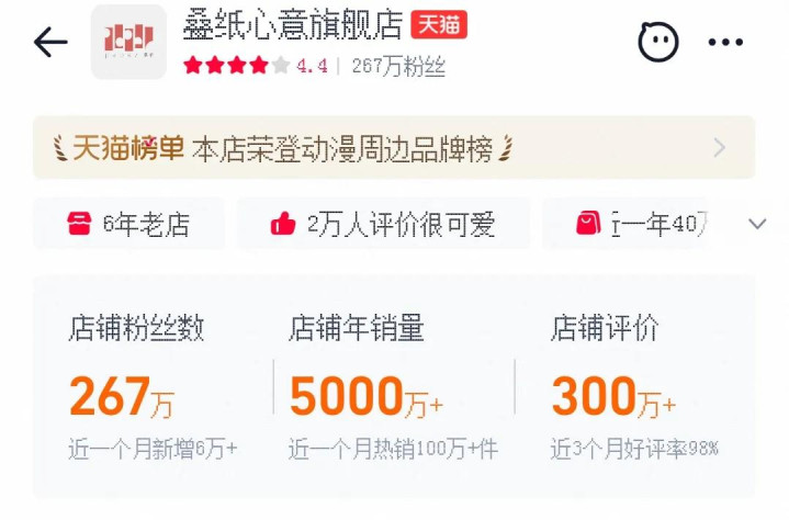 起先不得不讲的,就是一样分量级的叠纸。在电商平台的榜单上,叠纸情意旗舰店通常与miHoYo旗舰店一同进入前三,店铺信息显现年销量卓绝5000万。