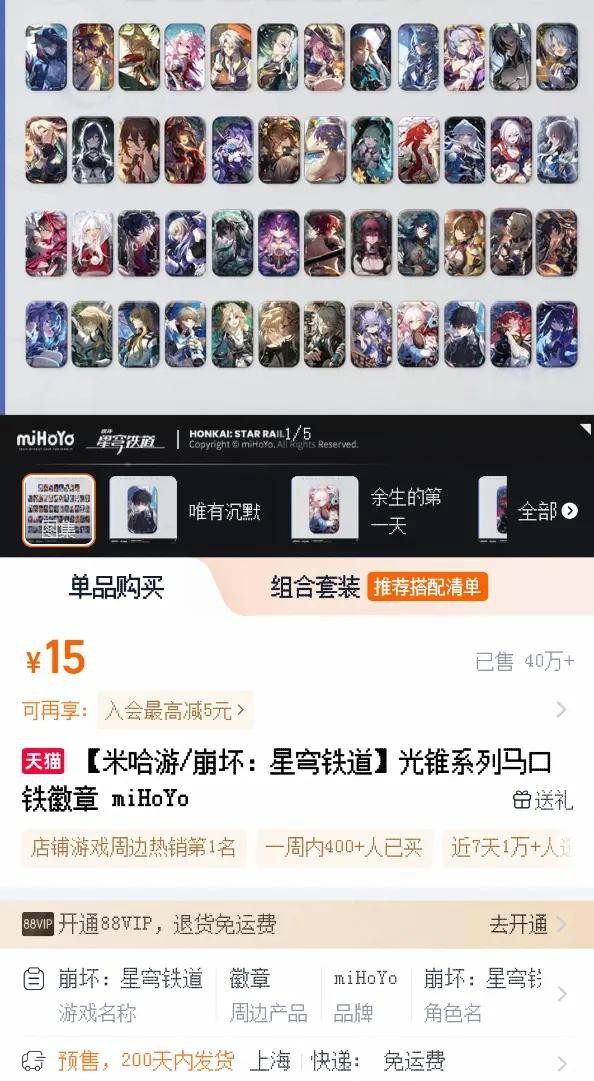 点开这些店铺里卖得最火热的吧唧的商品页面,你会发现即使是200天内发货的预售商品,销量也均在十万量级。据三文游调研和估算,米哈游旗下IP单论吧唧的销量就在亿级,利润达到十亿元级别。