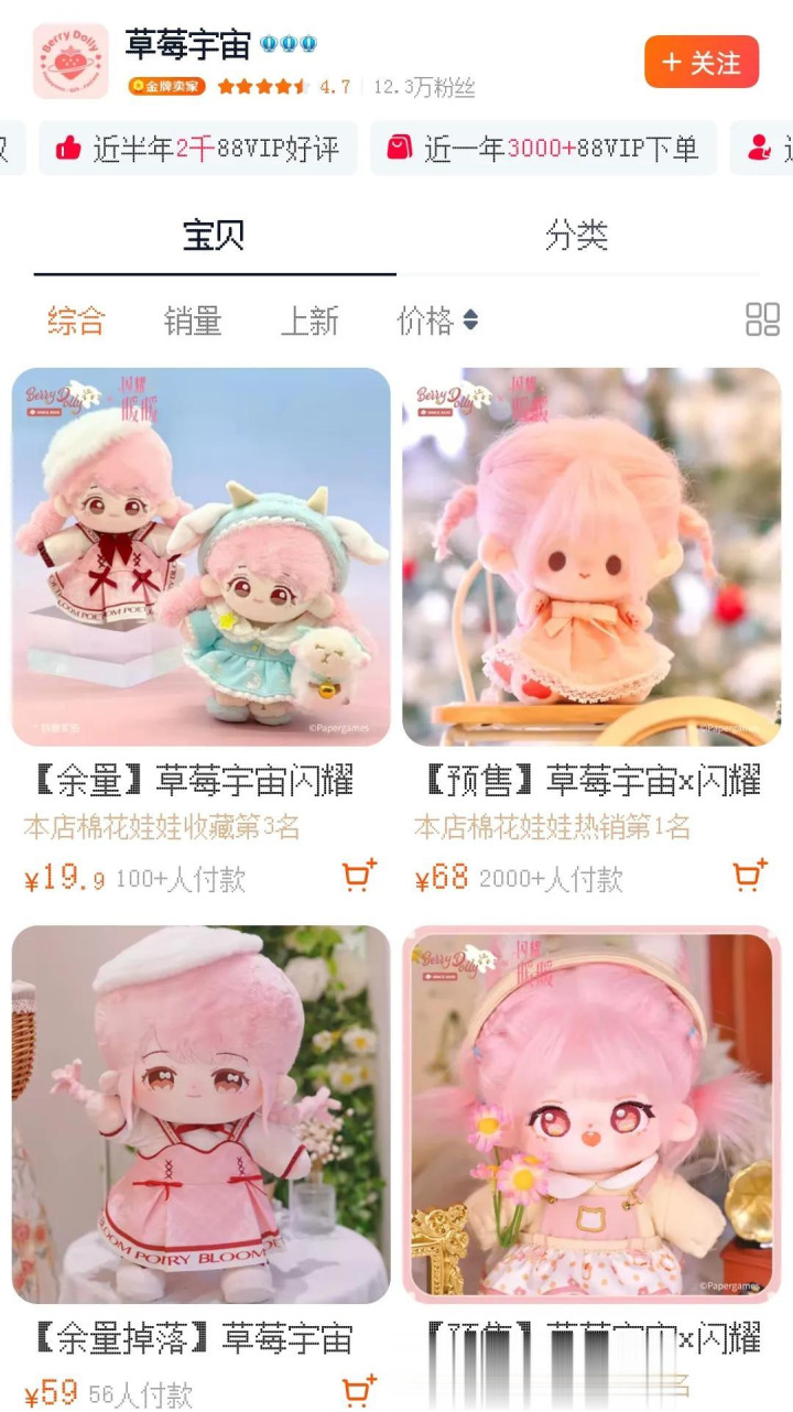 米哈游领有雄伟的Z世代女性用户群体,面向这一垂直界限投资并不奇怪。本质上,点开十二光年旗下的品牌店,你会发现店内的主要商品是忽闪暖暖IP的棉花娃娃。在养殖品界限中,这一样是一个热销品类。