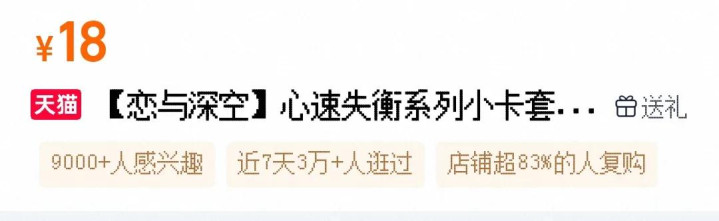 目下,叠纸店内似乎并未开启销量数据显现。不外据ACGx报谈,《恋与深空》的多个系列徽章,单品销量都曾打破100万——该数据还只是平台可对外显现的上限。同期,叠纸店铺的复购率也高得吓东谈主,页面显现为超83%东谈主复购。