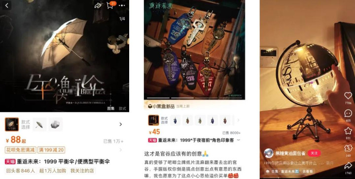 是以除了老例的吧唧、立牌等居品自己好评就不少以外,《1999》还有好多相配规的附近联想,比如剧情里出现过的均衡伞,与变装设定系缚的钥匙门牌……这些谛视调性和个性化的联想,让附近也成了《1999》的一块牌号。