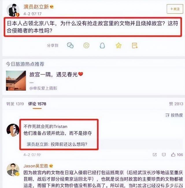面临网友科普“1933年起故宫13427箱文物分批南迁,大齐东谈主视死如归护宝才得以保全”的史实,他非但不予校服,反而转发歪曲历史的著述,将南京大屠杀歪曲为“日军表情变坏所致”,把故宫保全归因于“北平盲从快”。